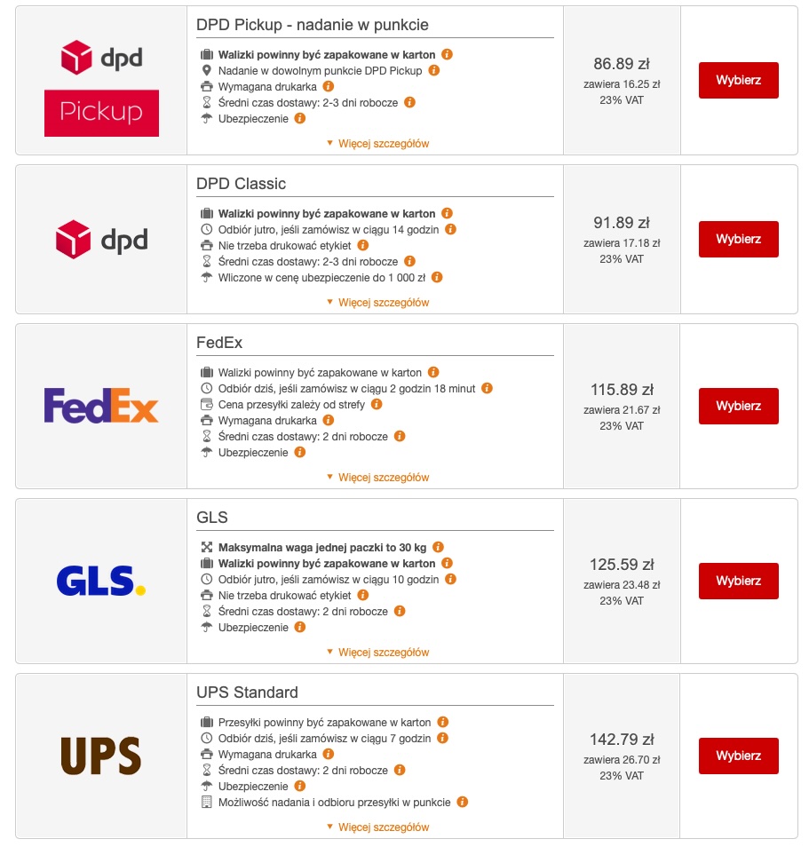Waga | DPD nadanie w punkcie | DPD "od drzwi do drzwi" | FedEx | GLS | UPS |