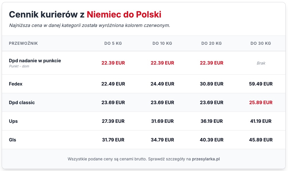 Najtańszym kurierem z Niemiec do Polski, który przetransportuje paczkę o wadze do 20 kg jest kurier DPD nadanie w punkcie oraz DPD Classic. Koszt takiej usługi to 22.39 EUR przy samodzielnym nadaniu w punkcie DPD i 23.69 EUR przy odbiorze przez kuriera DPD. Jeśli nie chcesz korzystać z usług kuriera do Polski DPD, to kolejną najtańsza opcją jest FedEx z ceną 30.89 EUR za transport 20 kg przesyłki z Niemiec.