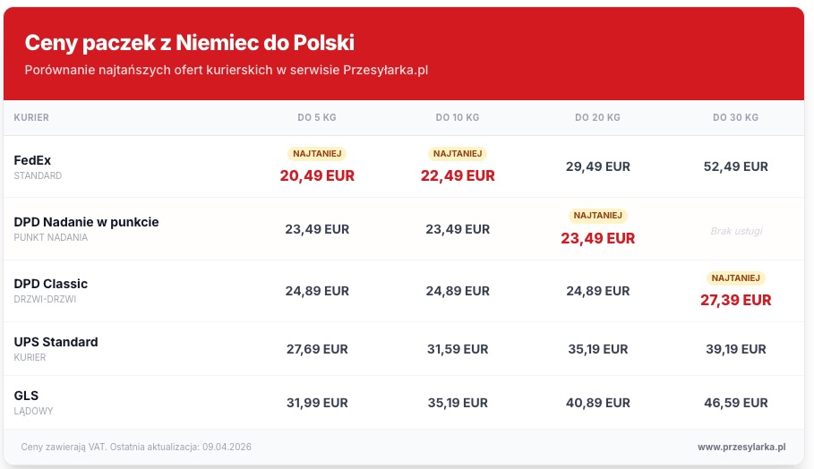 Najtańszym kurierem z Niemiec do Polski, który przetransportuje paczkę o wadze do 20 kg jest kurier DPD nadanie w punkcie oraz DPD Classic. Koszt takiej usługi to 23.49 EUR przy samodzielnym nadaniu w punkcie DPD i 24.89 EUR przy odbiorze przez kuriera DPD. Jeśli nie chcesz korzystać z usług kuriera do Polski DPD, to kolejną najtańsza opcją jest FedEx z ceną 29.49 EUR za transport 20 kg przesyłki z Niemiec.