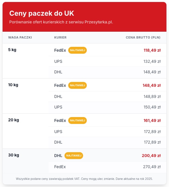 Cena wysyłki paczki do UK o wadze 5 kg zależy od przewoźnika i wybranej usługi. W 2025 roku najtańsza opcją jest serwis FedEx, który kosztuje 114,49 zł, następnie UPS z ceną rzedu 130,49 zł i DHL, gdzie transport do UK kosztuje 164,89 zł. Dokładne ceny dla innej wagi sprawdzisz w kalkulatorze na Przesyłarka.pl.